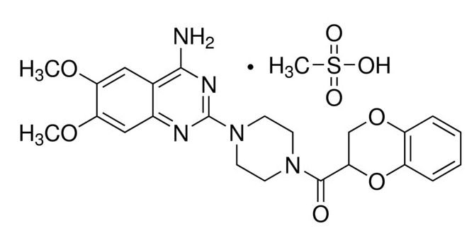 Doxazosin monomethanesulfonate; Normothen; Supressin; UK 33274-27; 1,4-Benzodioxin, piperazine deriv. (ZCI); Piperazine, 1-(4-amino-6,7-dimethoxy-2-quinazolinyl)-4-[(2,3-dihydro-1,4-benzodioxin-2-yl)carbonyl]-, monomethanesulfonate (9CI); 2-[4-(2,3-Dihydro-1,4-benzodioxine-2-carbonyl)piperazin-1-yl]-6,7-dimethoxyquinazolin-4-amine; methanesulfonic acid; Alfadil; Cardenalin; Cardran; Cardular; Cardura; Cardura (pharmaceutical); Cardura XL; Carduran; Diblocin; Dosin; Doxacard; Doxacor; doxazolazine mesylate